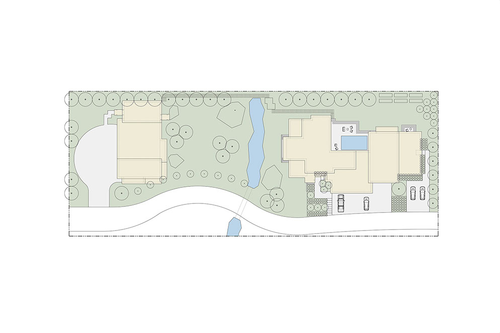 The modern vernacular is created with clean volumes, thin roof planes, precise detailing, and numerous outdoor connections to create a serene environment. The design employs a natural palette of materials including tile paneling, composite wood siding, and board-formed concrete to reflect the client’s fondness for simplicity.