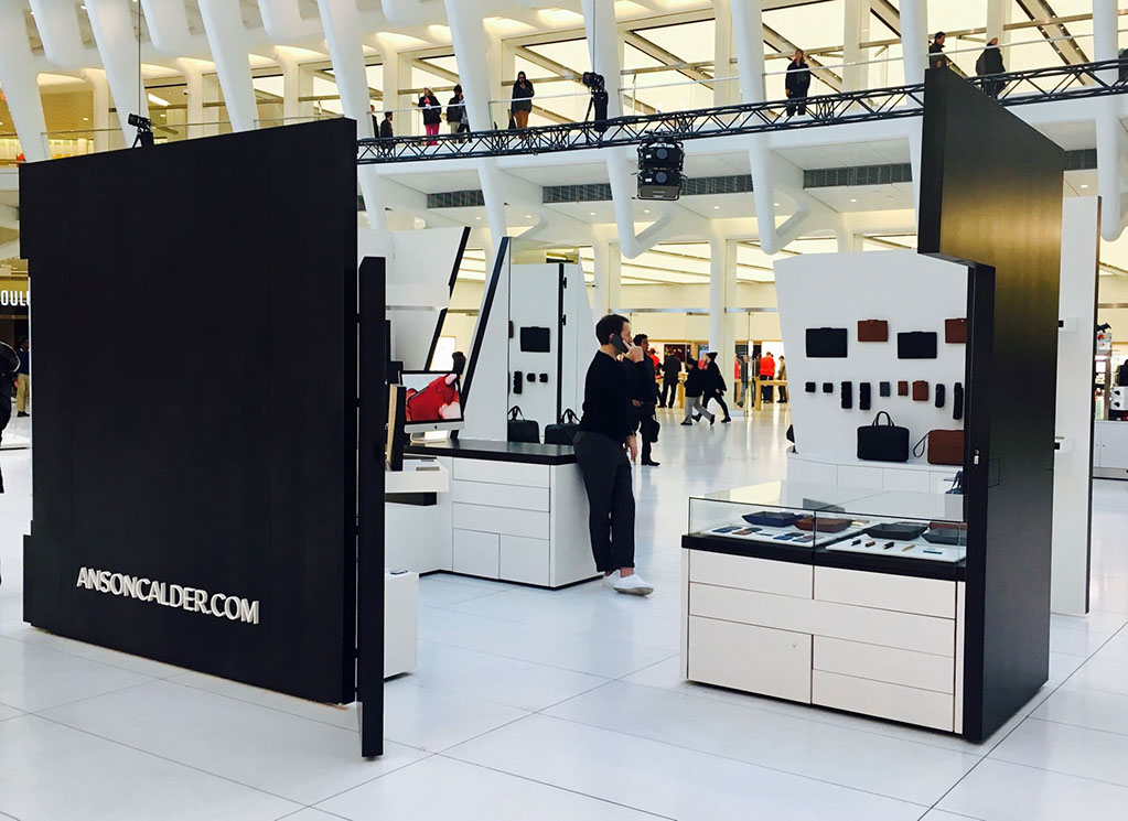 Anson Calder (AC) is an emerging New York City-based accessories company crafting luxury leather goods for the essential things you carry. Sanders Associates Architects worked with founder Curt Calder to design a Kiosk for the new Westfield World Trade Center Oculus that would identify the brand while creating an environment to curate the innovative luxury leather goods. The opened Kiosk is designed to create a living laboratory where customers can create an adaptable carry system customized to the individuals work process and personality.