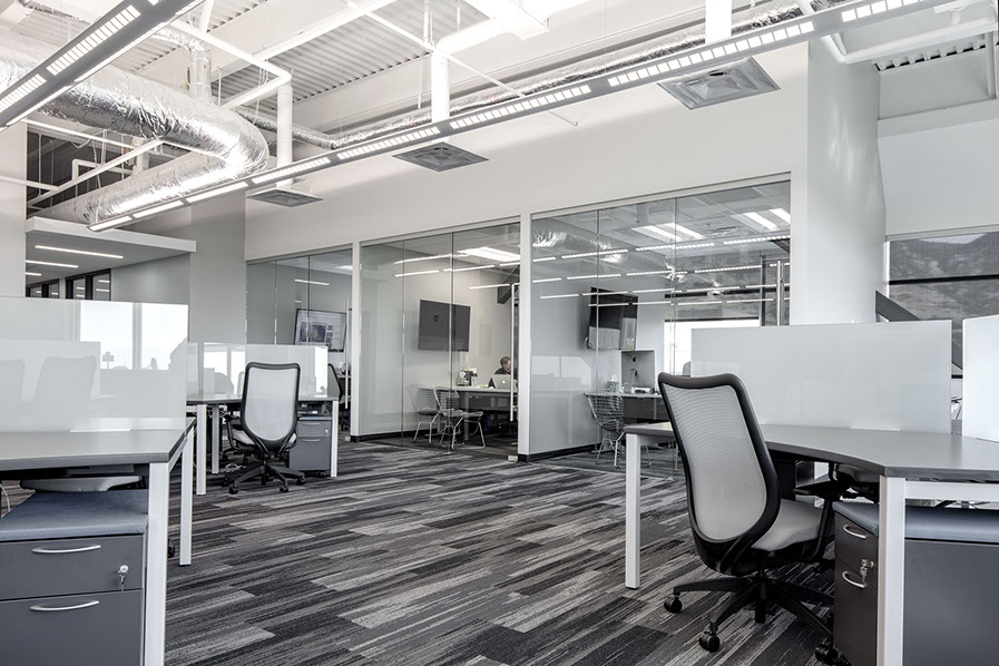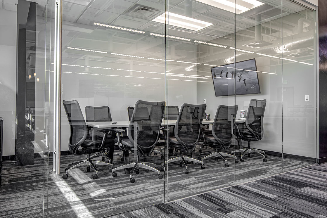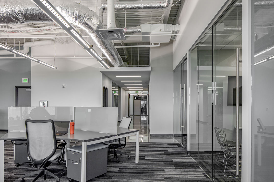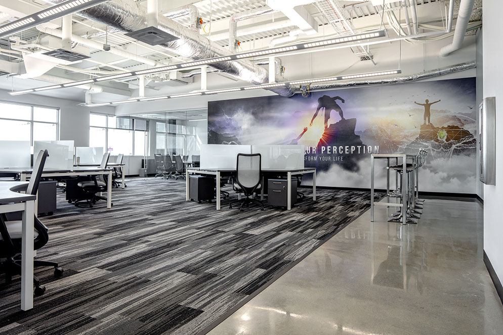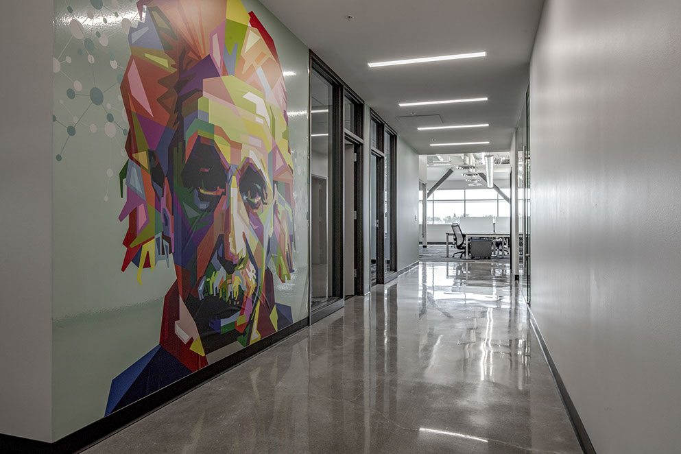 The use of glass in the office design brings daylight into the interior of the space and aids in promoting collaboration through visual connection. Unique materials are used throughout, including polished concrete, multi-hued paints, exposed structure, and featured mural walls to inspire and motivate staff. The environmental graphics support the company’s vision through use of imagery, text and form.