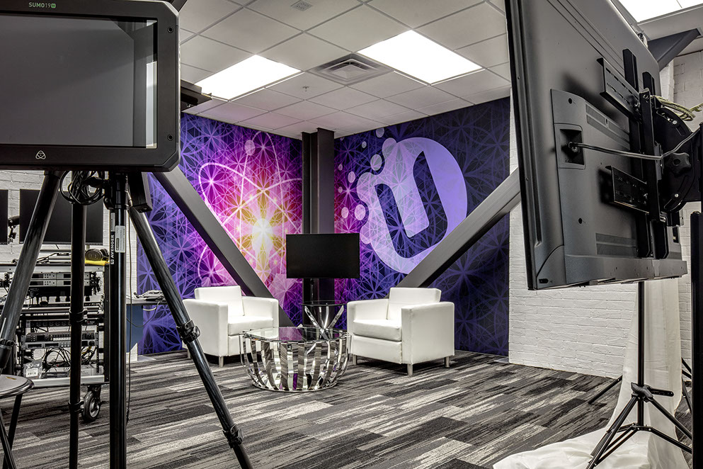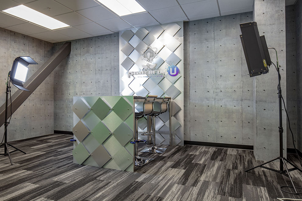 Powerful U tasked Sanders Associates Architects to design a fresh and modern workplace that would both enable the team to work more collaboratively, as well as inspire employees and visitors. The team worked to create a flexible plan with ancillary spaces scattered throughout the plan including a large break-room, open collaboration areas, conference rooms, and three filming studio spaces.