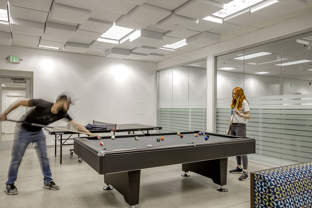 The workspace enables staff to engage in a way that wasn’t possible before. The end result represents a workspace with their corporate brand identity and departmental workflow. The workplace environment is designed to promote transparency, light and interconnected space. In addition the workplace includes a large breakroom, game room, and an open lounge area.