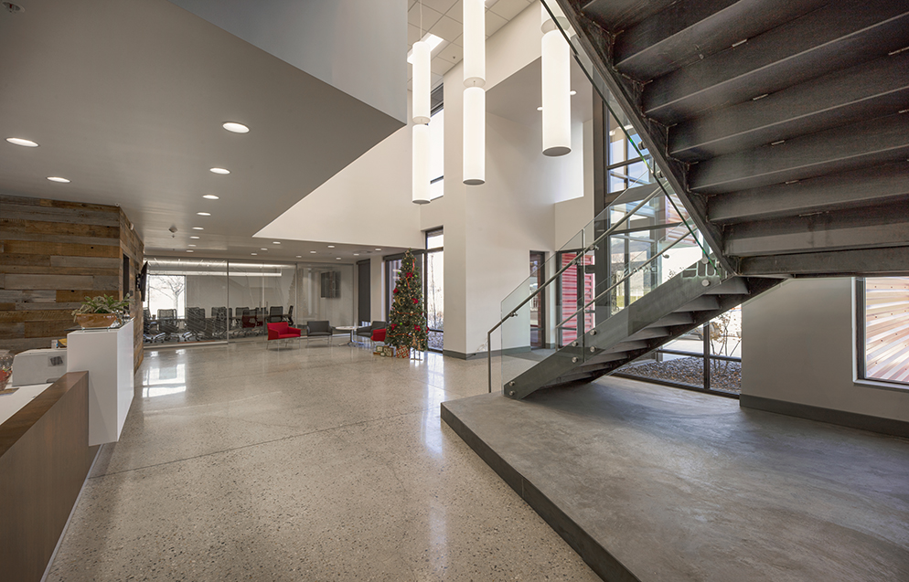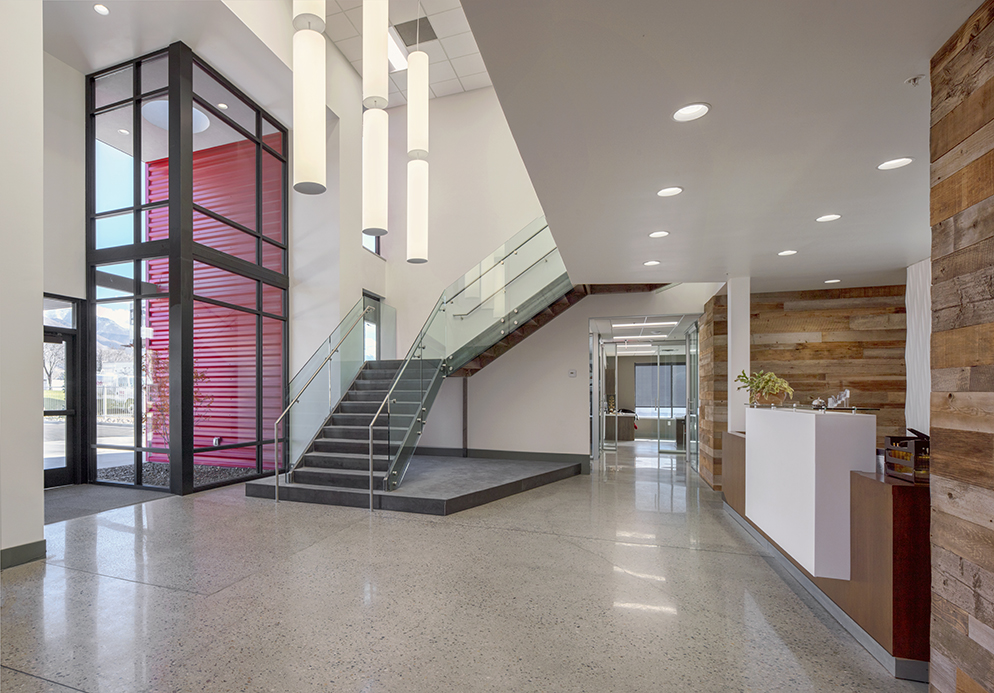 The design also provided a re-imaging of the building front to express Wadman Corporations unique personality. The front of the building is setback from a major interstate, creating an opportunity to communicate the company's brand to a large number of people. The building design uses rectilinear massing, directional changes in the metal paneling and bright colors to create something eye catching while distinguishing the Wadman Brand. Our approach delivers improved recognition and a better understanding of the firm mission, vision and values.